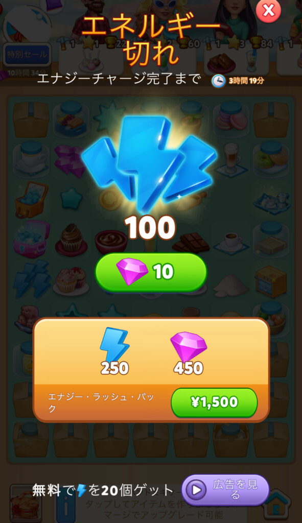 必要ダイヤ数と広告視聴でエネルギー回復は毎日リセットされます。