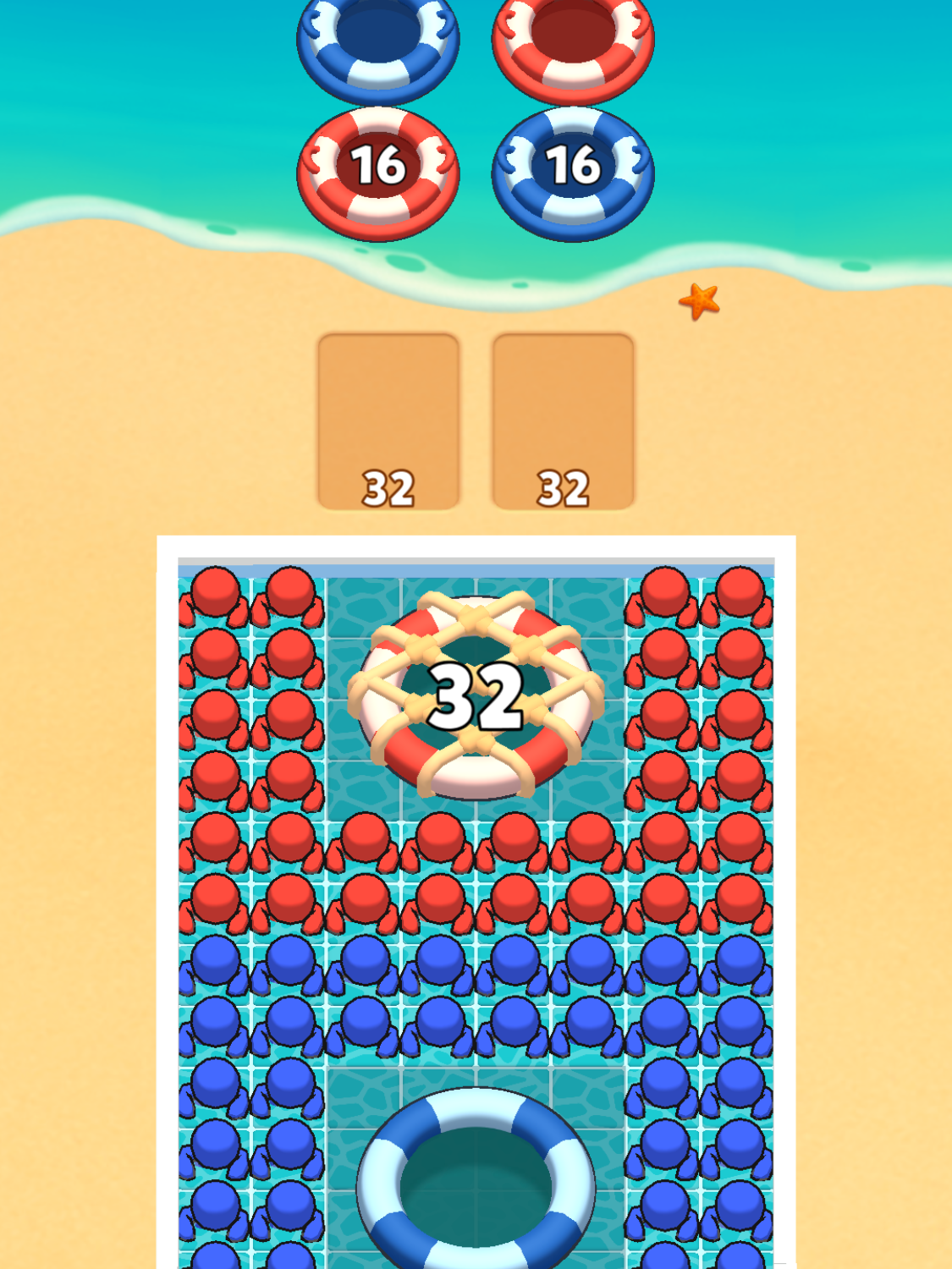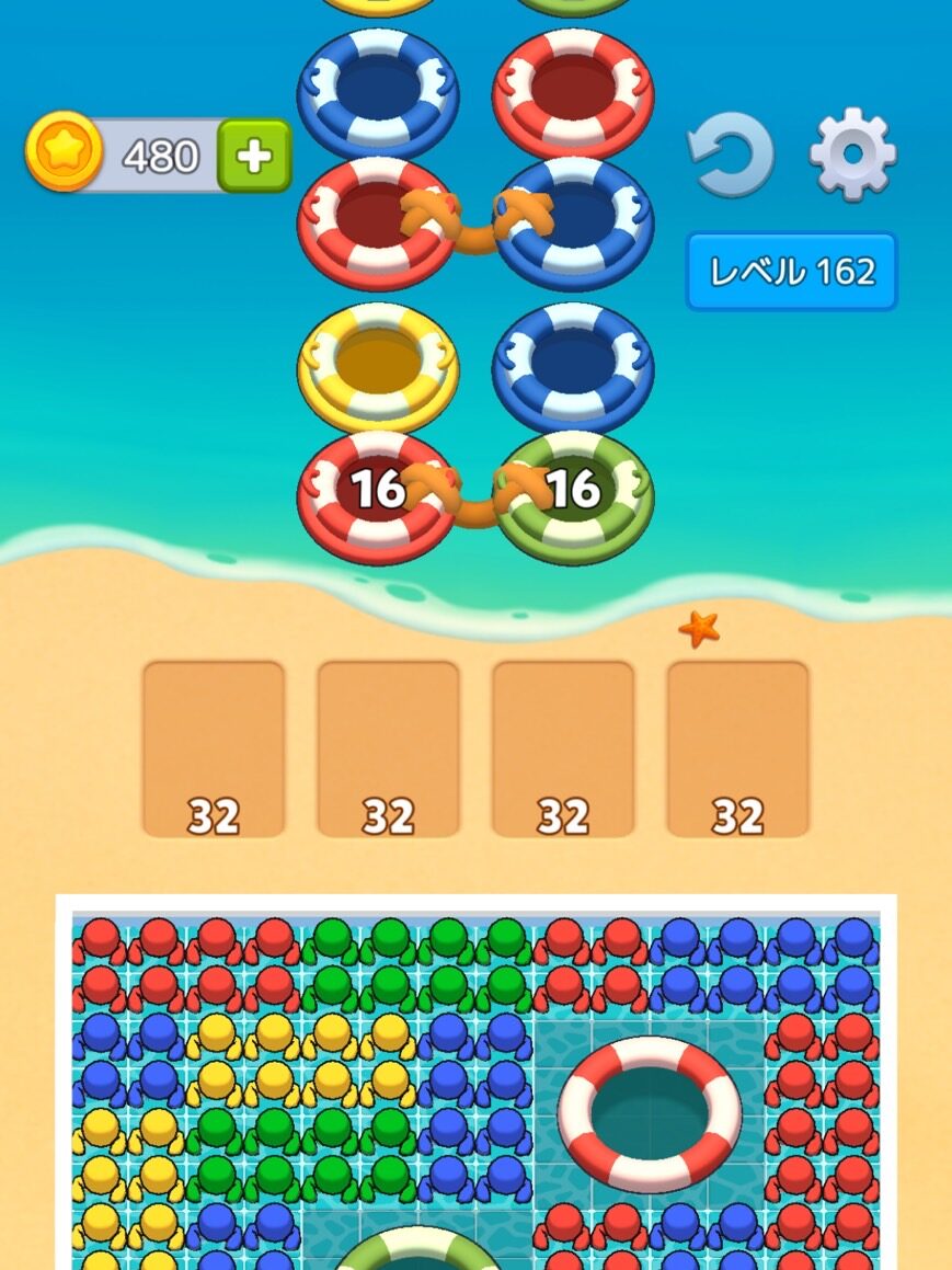 - 海の浮き輪が繋がっている:両方の浮き輪に16人ずつ乗らないと海に出発しない