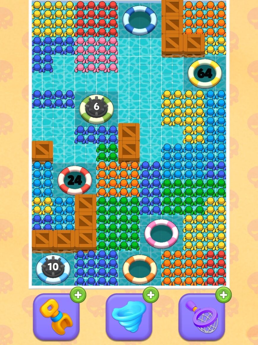 - 盤面と海の間の待機場所は、4か所(1か所につき32人までOK)。スコップアイテムで+1可能